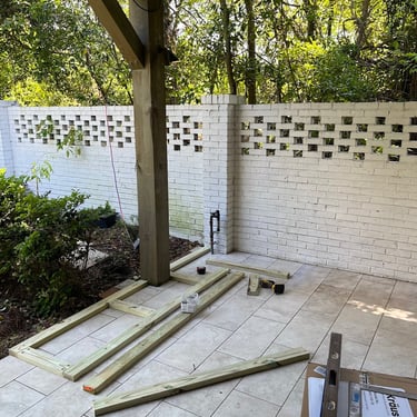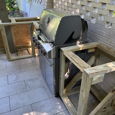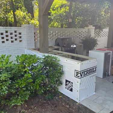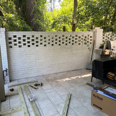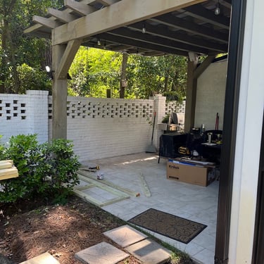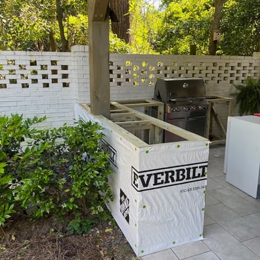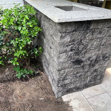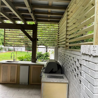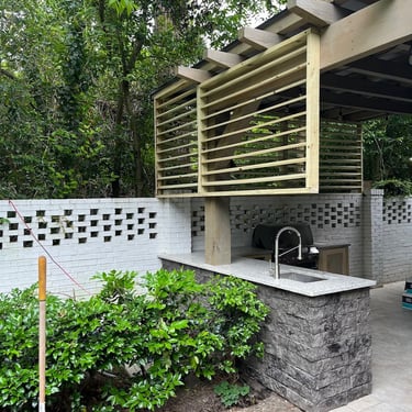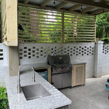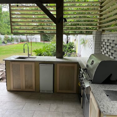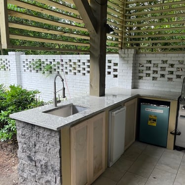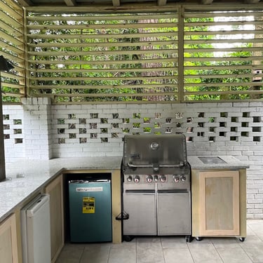 • Full outdoor kitchen space with grill, granite countertops, sink, cabinets, refrigerator and shaded planks.